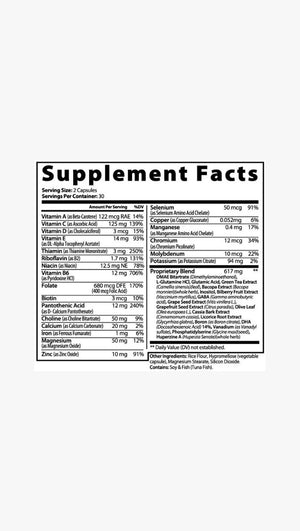 Ingredientes: Vitamina A (como betacaroteno), vitamina C (como ácido ascórbico), calcio (como carbonato de calcio), hierro (como fumarato ferroso), vitamina D (como colecalciferol), vitamina E (como DL-alfa-tocoferil-acetato), vitamina B1 (como mononitrato de tiamina), vitamina B2 (como riboflavina), vitamina B3 (como niacina), vitamina B6 (como clorhidrato de piridoxina), folato, biotina, vitamina B5 (como D-pantotenato de calcio), magnesio (como óxido de magnesio), zinc (como óxido de zinc), selenio (quelato de aminoácido de selenio), cobre (como gluconato de cobre), manganeso (como quelato de aminoácido de manganeso), cromo (como picolinato de cromo), molibdeno, potasio (como citrato de potasio), colina (como bitartrato de colina), mezcla patentada (bitartrato de DMAE, clorhidrato de L-glutamina, Ácido glutámico, extracto de té verde, extracto de bacopa, inositol, extracto de arándano, GABA, extracto de semilla de uva, extracto de semilla de pomelo, hoja de olivo, extracto de corteza de canela, extracto de raíz de regaliz, boro, DHA 14%, vanadilo, fosfatidilserina, huperzina A. Hipromelosa (cápsula vegetal) , harina de arroz, estearato de magnesio, dióxido de silicio.
