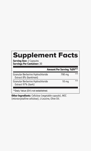Ingredients: Granular Berberine Hydrochloride Extract 97% (bark), Granular Berberine Hydrochloride Extract 8% (bark/root), Cellulose (vegetable capsule), MCC (microcrystalline cellulose), L-Leucine, Olive Oil.