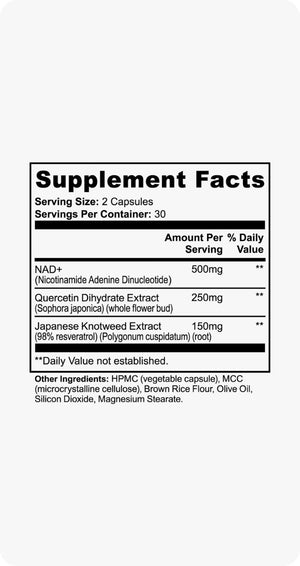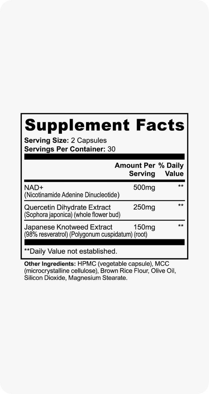 Ingredients: NAD+ (Nicotinamide Adenine Dinucleotide) (500 mg), Quercetin Dihydrate Extract (Sophora japonica) (whole flower bud) (250 mg), Japanese Knotweed Extract (98% Resveratrol) (Polygonum cuspidatum) (root) (150 mg), HPMC (vegetable capsule), Microcrystalline Cellulose (MCC), Brown Rice Flour, Olive Oil, Silicon Dioxide, Magnesium Stearate.